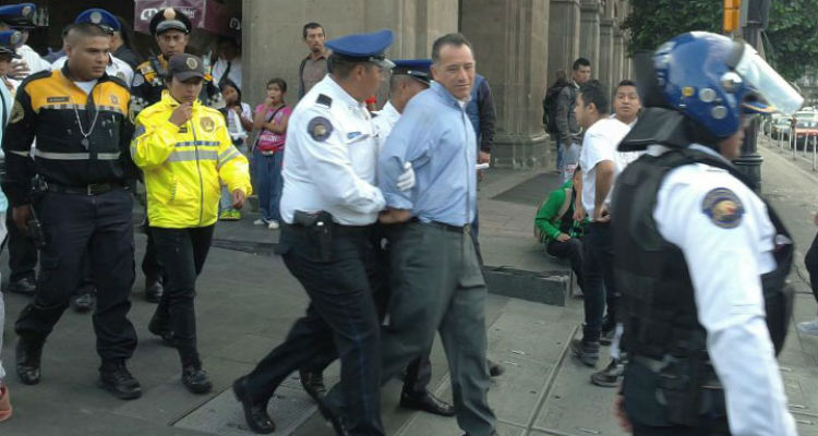En el centro de la capital, los hombres comenzaron a agredir verbalmente a una policía que les pidió respetar el semáforo y dejar pasar a los automovilistas en la esquina de Pino Suárez y el circuito de la Plaza de la Constitución.