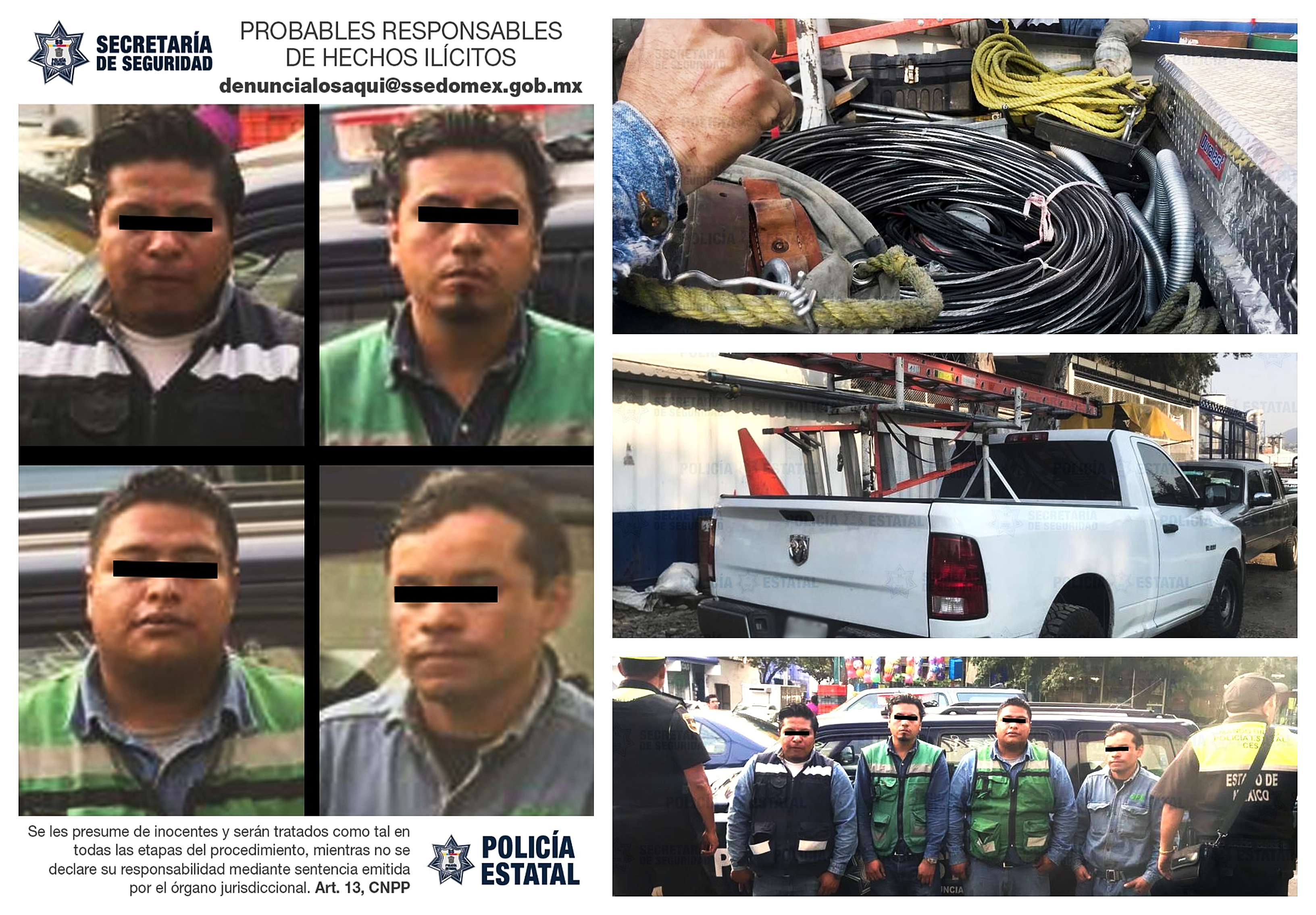 Moisés “N”, Gustavo “N”, Noel Esaú “N” y Eder Obed “N”, de 36, 32, 26 y 36 años de edad, respectivamente, fueron conducidos ante la autoridad ministerial de la Procuraduría General de la República (PGR) con sede en el municipio de Tlalnepantla, para deslindar responsabilidades. A los supuestos empleados se les aseguraron, además, una camioneta Dodge Ram, color blanco; dos cizallas e igual número de rollos de cable; un par de escaleras telescópicas, dos bandolas y herramientas para electricista.