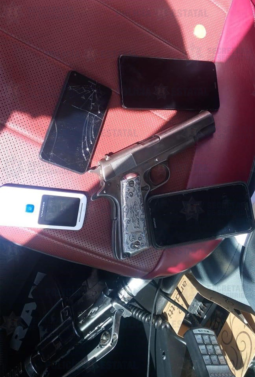 Al concluir, se les aseguró un arma corta calibre 45 milímetros, un costal con un aproximado de 20 kilogramos de hierba verde, con características de marihuana, cuatro teléfonos celulares de diferentes marcas, así como un equipo de radio comunicación.