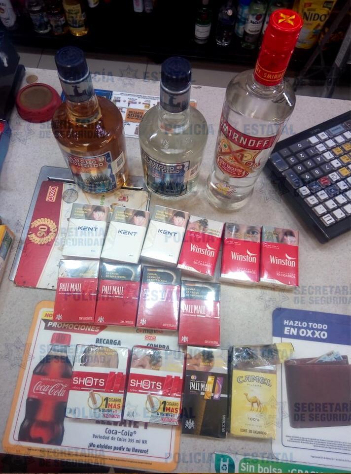 Entre sus pertenencias, al adolescente se le hallaron dos botellas de bebida alcohólica, además de 14 cajetillas de cigarros de diferentes marcas y un arma blanca con la que amedrentaron a su víctima.