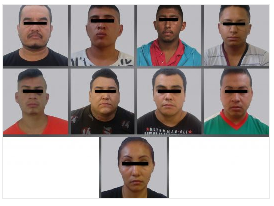 Los presuntos delincuentes fueron identificados como Cristian “N”, de 25 años de edad; Edgar “N” de 27 años; José Luis “N”, de 40 años; Julio César “N”, de 31 años; Alejandro Adrián “N”, de 26 años; Mayte “N”, de 29 años; Oswaldo “N”, de 29 años; Oscar “N”, de 22 años, y Eduardo “N”, de 22 años.
