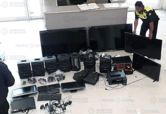 Acorde al protocolo, los uniformados efectuaron una revisión preventiva al sospechoso que trasladaba en varias bolsas cuatro pantallas de diferentes tamaños, seis bocinas, cuatro monitores de computadora, teclados y mouses, así como una laptop e impresora, objetos que aparentemente pertenecen a la institución educativa que se encuentra en la zona.