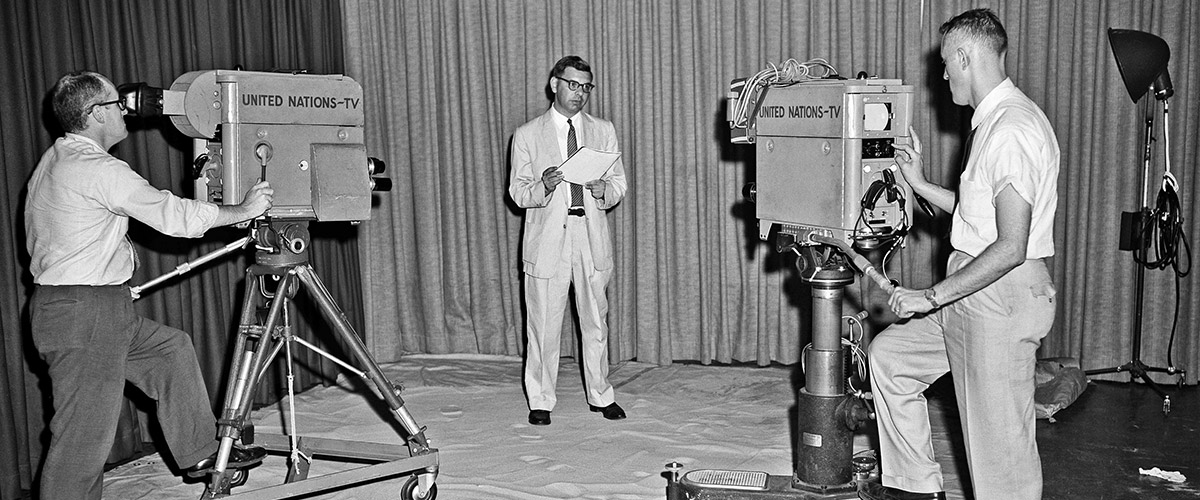 Prueba de cámara en la sede de la ONU, realizada en junio de 1957, en preparación para un programa de televisión sobre la Fuerza de Emergencia. Foto ONU/MB