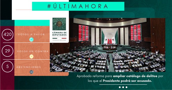 En el pleno de la Cámara de Diputados se aprueba la reforma que elimina el fuero constitucional al presidente de la República, por lo que podrá ser acusado no solo por traición a la Patria, sino también por actos de corrupción, delitos electorales o cualquiera de los incluidos en el artículo 19 de la Constitución.
