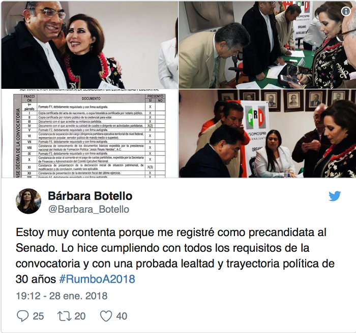 Bárbara Botello a través de un tweet que emitió a través de su cuenta de Twitter señaló lo siguiente. “Estoy muy contenta porque me registré como precandidata al Senado. Lo hice cumpliendo con todos los requisitos de la convocatoria y con una probada lealtad y trayectoria política de 30 años #RumboA2018”.