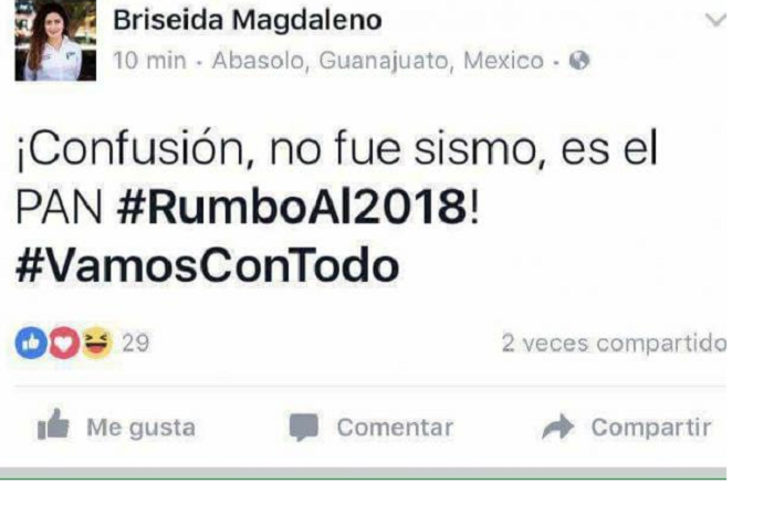 Briseida Magdaleno, secretaria estatal de Acción Juvenil del PAN en Guanajuato, tomó el terremoto de 8.2 grados para promocionar a su partido y asegurar que lo ocurrido el jueves pasado no fue un sismo sino el PAN ‘rumbo al 2018’.