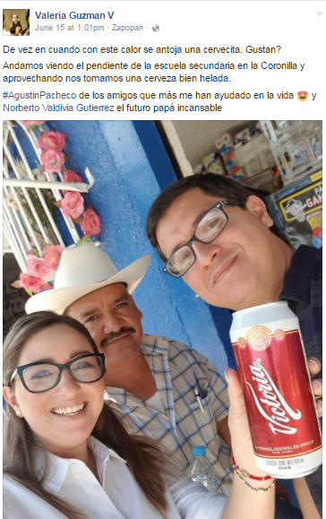 A Valeria Guzmán diputada del PRI por el quinto distrito de Zapopan se le hizo fácil tomarse unas chelas en una visita de trabajo y ahora no se la acaba.