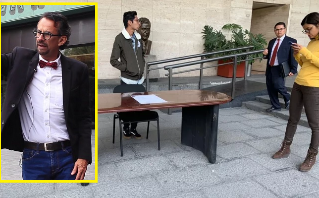 El diputado Javier Hidalgo (Morena) protestó por el despido de su secretaria en la plaza principal de la Cámara de Diputados.