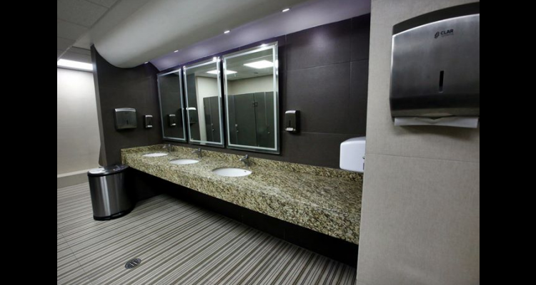 Además, se colocaron lavabos de mármol, espejos nuevos y hasta botes de basura de aluminio, que son el material más costoso. Los muros de separación entre sanitarios son color gris ahumado, que le dan un aire modernista al espacio recién estrenado.