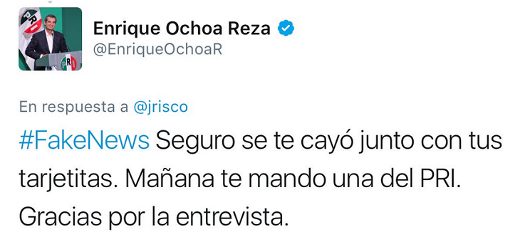 “#FakeNews Seguro se te cayó junto con tus tarjetitas. Mañana te mando una del PRI. Gracias por la entrevista”.