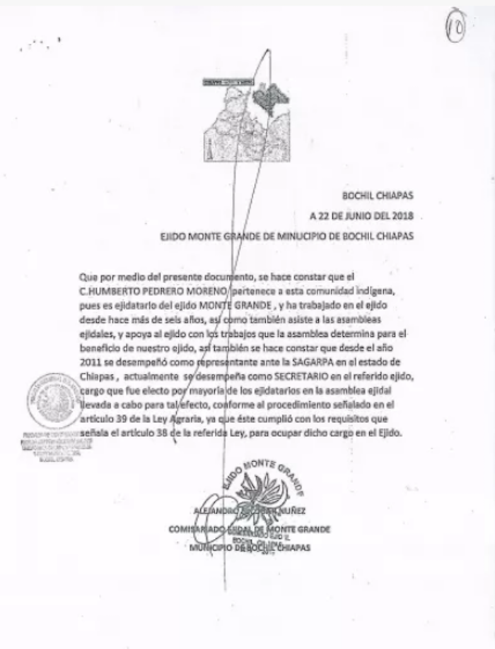 “Pues es ejidatario del ejido MONTE GRANDE, y ha trabajado en el ejido desde hace más de seis años, así como también asiste a las asambleas ejidales, y apoya al ejido con los trabajos que la asamblea determina para el beneficio de nuestro ejido, así también se hace constar que desde el año 2011 se desempeñó como representante ante la SAGARPA en el estado de Chiapas, actualmente se desempeña como SECRETARIO en el referido ejido, cargo que fue electo por mayoría de los ejidatarios en la asamblea ejidal llevada a cabo para tal efecto”, detallaba el documento, según difundió Chiapas Paralelo.