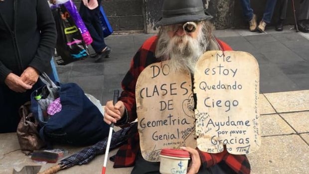 “Doy clases de geometría genial” dice una de las caras del cartel casi deshecho que lo acompaña. “Estoy quedándome ciego. Ayúdame por favor.”, sentencia la otra parte.
