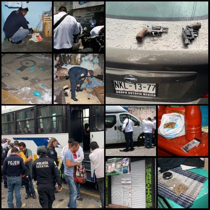 Durante los operativos fue asegurado lo siguiente: 545 dosis de marihuana, 22 dosis de cocaína, 4 armas de fuego (tres cal .380, y una cal .38 especial), 6 cartuchos útiles de diversos calibres, 5 armas prohibidas (dos navajas, un cuchillo, y dos bastones retráctiles), 11 vehículos con reporte de robo recuperados, 20 vehículos asegurados, 8 inmuebles fueron asegurados.