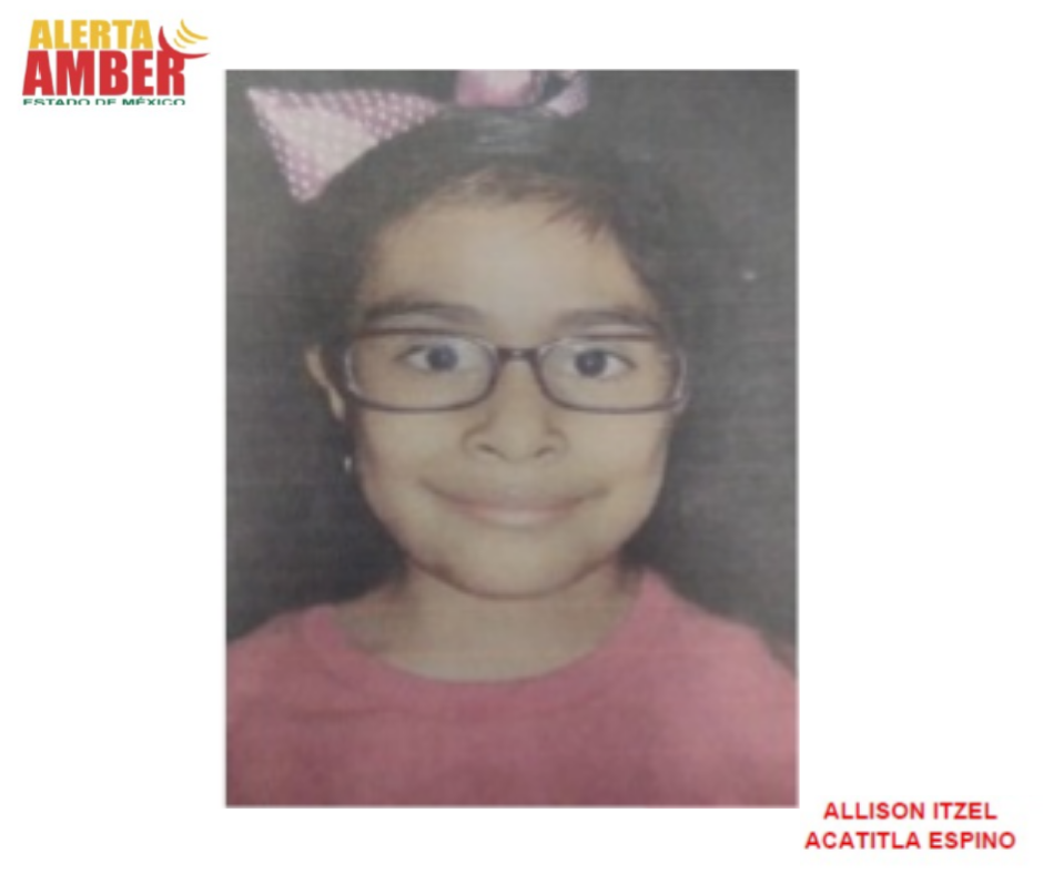 La Fiscalía General de Justicia del Estado de México (FGJEM) emitieron un boletín de Alerta Amber para localizar a Allison Itzel Acatitla Espino de 9 años, reportada como no localizada desde el día 17 enero de 2018, en Jardines de los Baez, 2da. Sección, municipio de Ecatepec de Morelos.