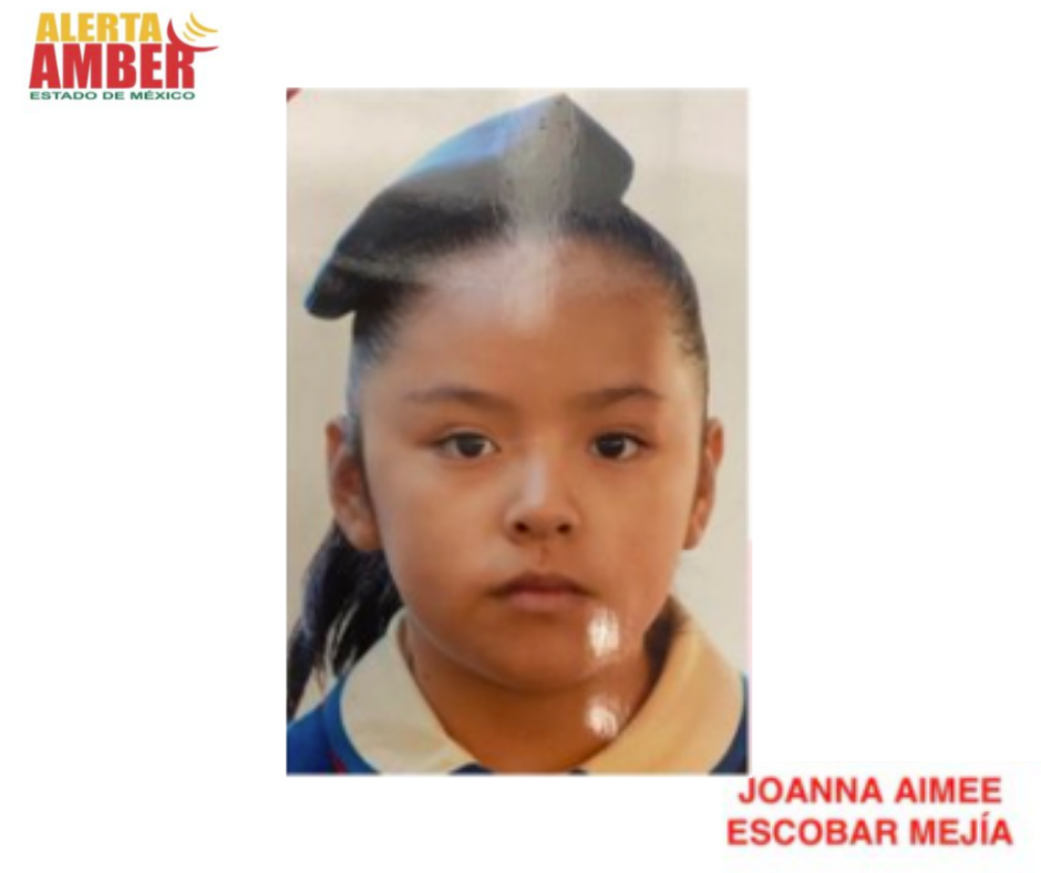 La Fiscalía General de Justicia del Estado de México (FGJEM) emitió un boletín de Alerta Amber para localizar a Joanna Aimee Escobar Mejía de 10 años.