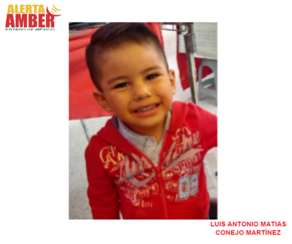 Autoridades del Estado de México emitieron un boletín de Alerta Amber para localizar a Luis Antonio Matias Conejo Martínez, de 3 años de edad, el cual fue visto por última vez el día 24 de julio de 2020, en la col. Santa Teresa I, en el municipio de Huehuetoca.