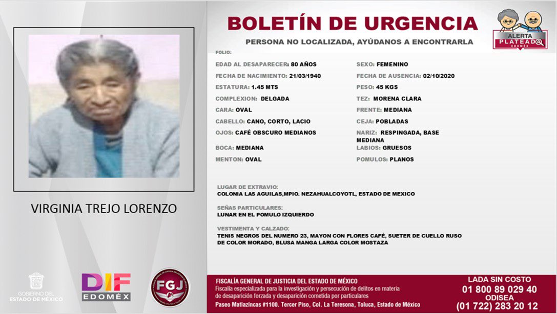 Autoridades del Estado de México emitieron una Alerta Plateada para localizar a Doña Virginia Trejo Lorenzo, de 80 años de edad, la cual fue vista por última vez en día 02 de octubre de 2020, en la colonia Las Aguilas, municipio de Nezahualcóyotl.