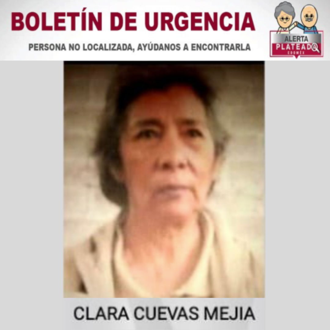 Autoridades del Estado de México emitieron un boletín de Alerta Plateada para localizar a Doña Clara Cuevas Mejía, de 62 años, la cual fue vista por última es el día 02 de enero de 2021, en Cuanalan, Acolman.