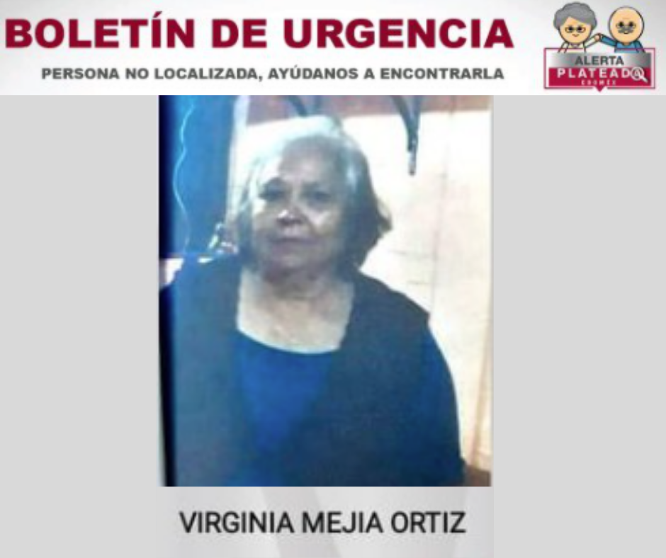Autoridades del Estado de México emitieron un boletín de Alerta Plateada para localizar a Doña Virginia Mejía Ortiz, de 60 años de edad, la cual fue vista por última vez el día 28 de noviembre de 2020, en la colonia Infonavit Centro, Cuautitlán Izcalli.