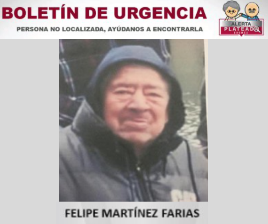 Autoridades del Estado de México emitieron un boletín de Alerta Plateada para localizar a Felipe Martín Farias, de 82 años de edad, el cual fue visto por última vez el día 14 de diciembre de 2020, en el Rincón de San Lorenzo, municipio de Toluca de Lerdo.