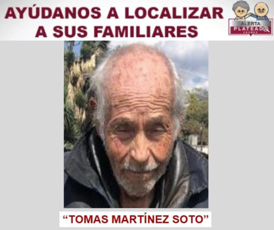 Autoridades del Estado de México emitieron un boletín de Alerta Plateada para localizar a los familiares de un hombre que refiere llamarse Tomas Martínez Soto, de aproximadamente 79 años de edad.