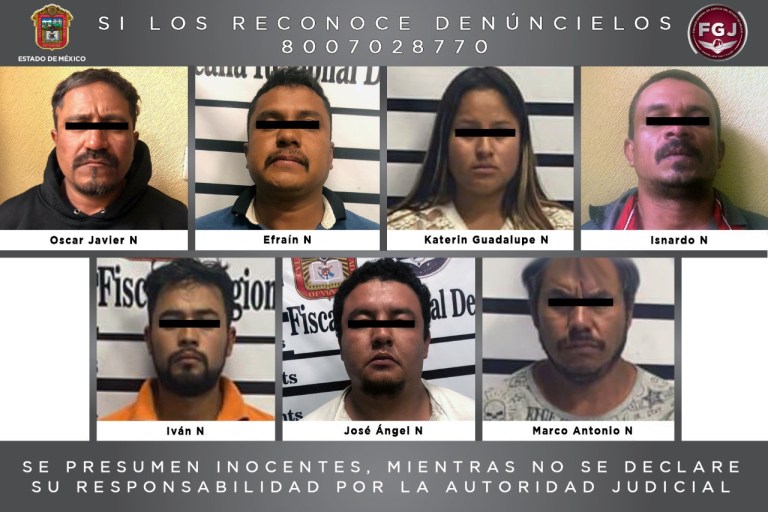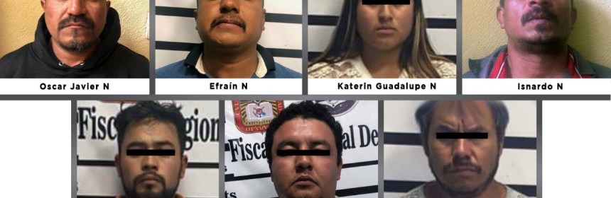 Los detenidos fueron identificados como Oscar Javier “N” de 35 años de edad; Isnardo “N” de 35 años; Efraín “N” 36 años; Marco Antonio “N” de 41; Iván “N” de 28 años; José Ángel “N” de 27 años y Katerin Guadalupe “N” de 19 años.