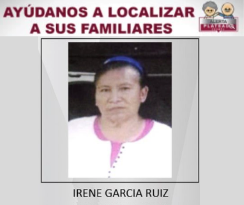 Autoridades del Estado de México emitieron un boletín de Alerta Plateada para localizar a Doña Irene Garcia Ruiz, de 62 años de edad, la cual fue vista por última vez el día 07 de septiembre de 2020, en el barrio Cesáreos, municipio de Chimalhuacán.