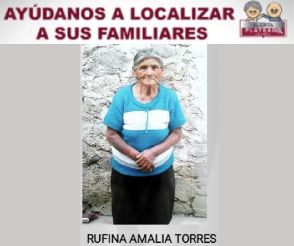 Autoridades del Estado de México emitieron una Alerta Plateada para localizar a Doña Rufina Amalia Torres, de 77 años de edad, la cual fue vista por última vez el día 27 de septiembre de 2020, en la colonia Espartaco, Ixtapaluca.
