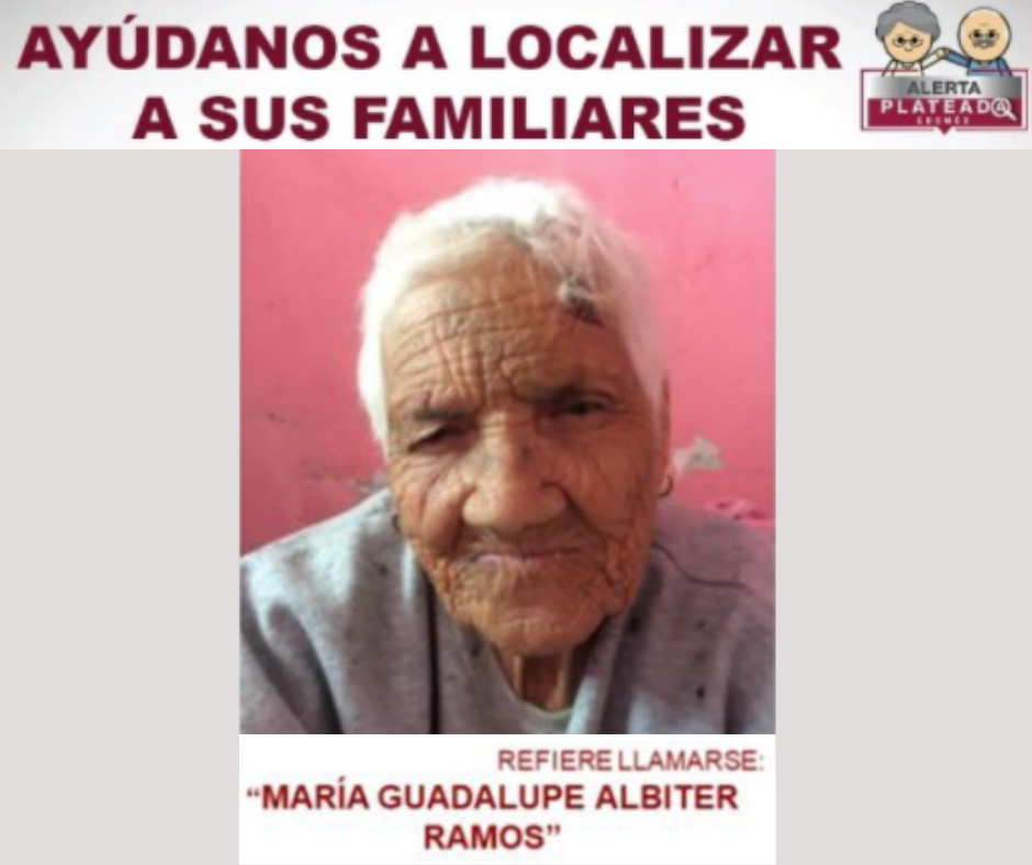 Autoridades del Estado de México emitieron un boletín de Alerta Plateada para localizar a los familiares de Doña María Guadalupe Albiter Ramos, de 77 años de edad.