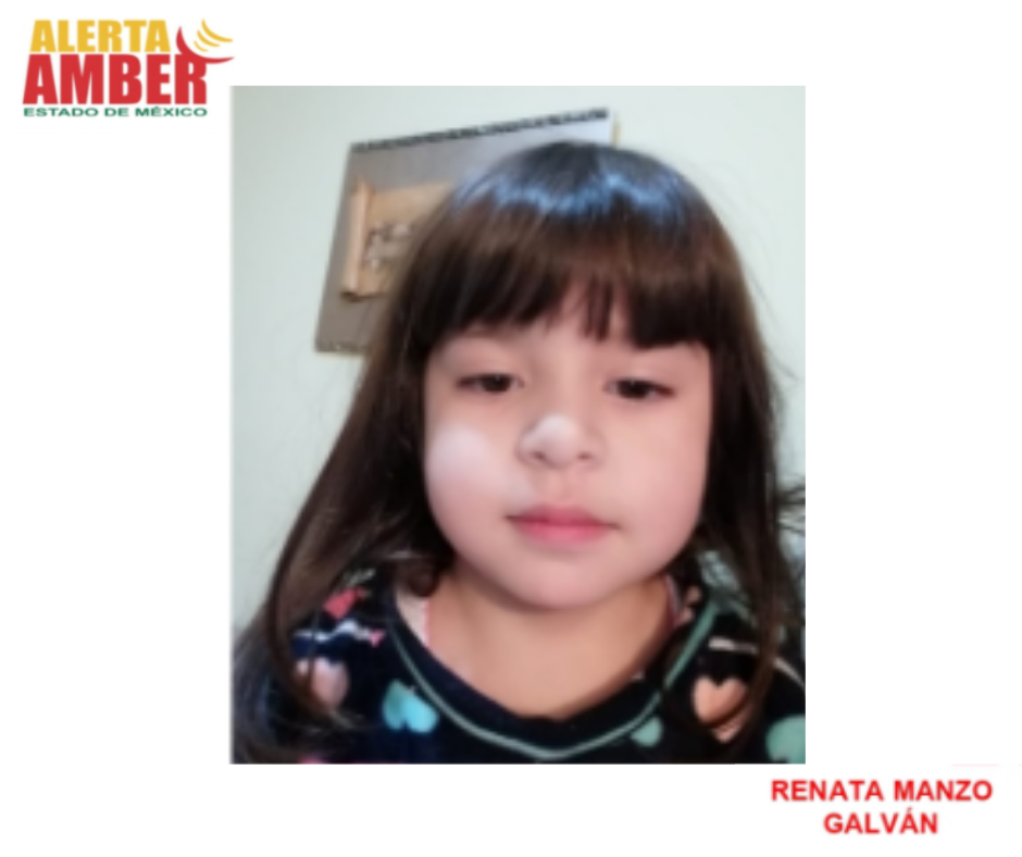 La Fiscalía General de Justicia del Estado de México (FGJEM) emitió un boletín de Alerta Amber para localizar a Renata Manzo Galván de 4 años de edad, la cual fue reportada como no localizada desde el 22 de noviembre de 2020 en San Cristóbal Huichochitlán, municipio de Toluca.