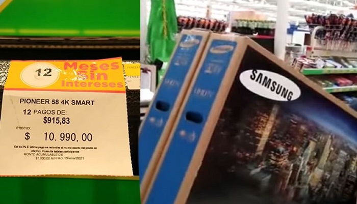De acuerdo a la grabación que circula en redes sociales un usuario que se encuentra dentro de la Bodega Aurrerá de la Plaza Mexiquense, municipio de Tecámac, muestra la oferta que existe en el precio de una pantalla inteligente de la marca Pionner de 58 pulgadas con definición 4K por menos de 11 pesos.