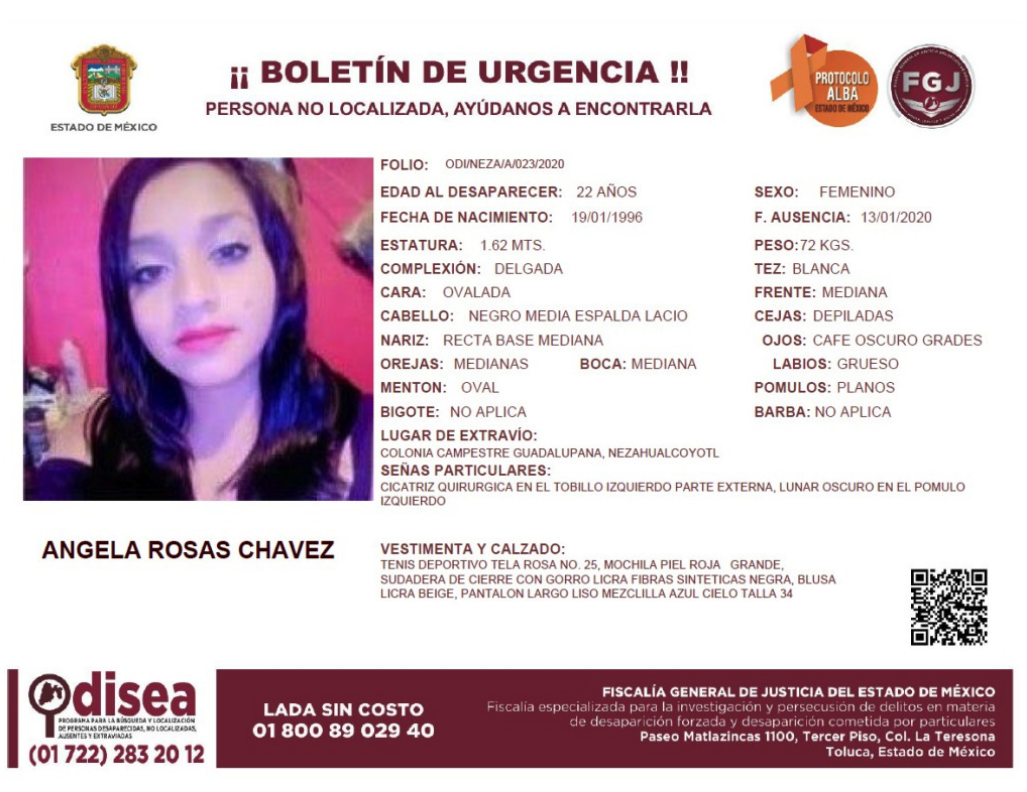Ángela Rosas Chavez de 22 años de edad fue vista por última vez cuando abandonó su hogar ubicado en la colonia Campestre Guadalupana, Nezahualcóyotl, para ir a su trabajo en la Secretaría de Seguridad Ciudadana de la Ciudad de México (SSC-CDMX), el pasado lunes 13 de enero a las 6:00 horas.