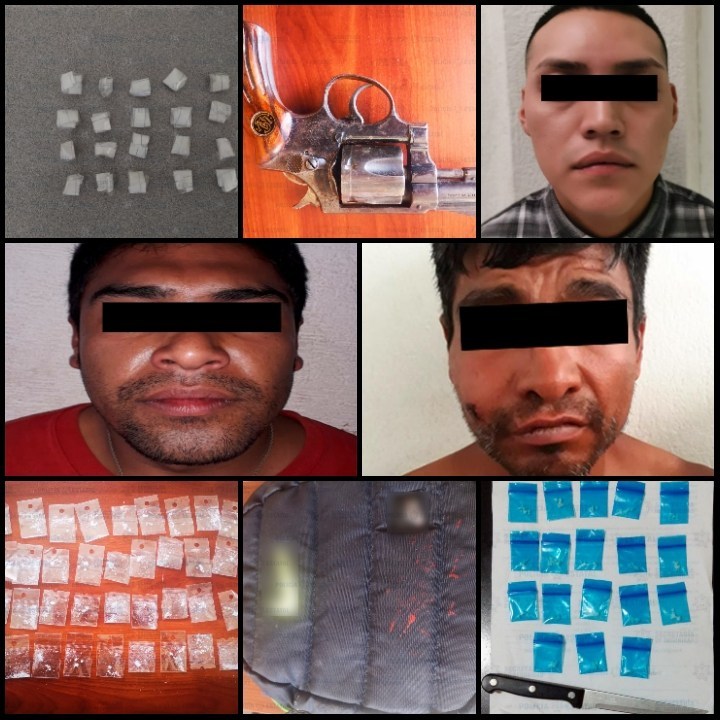 Cuando los efectivos de la Secretaría de Seguridad (SS) realizaban patrullajes de rutina en colonias de estas demarcaciones se dio la detención de Rafael “N” de 29 años de edad, a quien, acorde al protocolo de actuación y con apego a los derechos que la Ley le otorga, se le realizó una inspección hallándole una mariconera color negro, en la que guardaba un arma de fuego, tipo revolver, calibre 38 especial y 40 bolsas de plástico transparente que en su interior contenían una sustancia blanca con las características propias de la droga conocida como cristal, dando un total aproximado de 20 gramos.