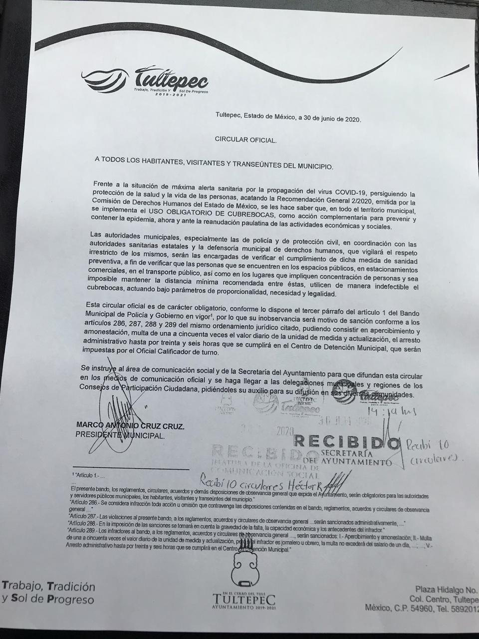 En Tultepec, el presidente municipal interino Marco Antonio Cruz Cruz, tomó una de sus primera medidas drásticas desde que asumió su cargo, al sustituir al alcalde Armando Portuguez tras su deceso, enviando una circular a todas las dependencias del gobierno municipal en la que establece que: «el uso obligatorio de cubrebocas para todas las autoridades, servidores públicos, visitantes y transeúntes del municipio», y para quien no acate esta disposición, se hará acreedor a una multa de 50 UMA’S, es decir de 86.88 pesos a 4 mil 344 pesos, o un arresto de 36 horas.