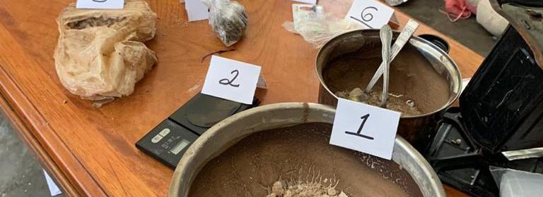 • 2 recipientes con sustancia en polvo y piedra para la elaboración de cocaína