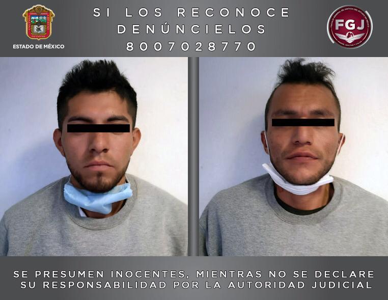 Elementos de la Fiscalía General de Justicia del Estado de México (FGJEM) aseguraron a dos sujetos identificados como Argenis Advinadaith “N” y Alfredo “N” quienes son investigados por su probable participación en el homicidio de un hombre, en este municipio.