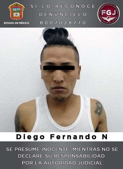 Elementos de la Policía de Investigación (PDI) de la Fiscalía Regional de Ecatepec de esta Fiscalía General de Justicia Estatal (FGJEM) detuvieron a un sujeto identificado como Diego Fernando “N”, alias “El Yeyco”, de 23 años de edad, quien habría participado con otro individuo en un asalto a los pasajeros de una unidad de transporte público, el pasado 24 de diciembre en este municipio. El robo fue captado por una cámara del vehículo de servicio público y dado a conocer mediante redes sociales.