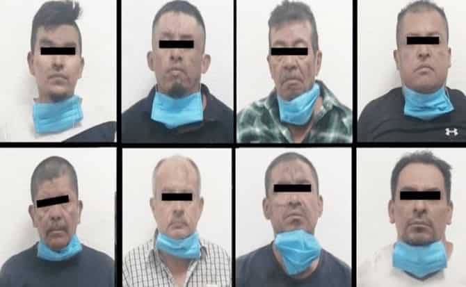 Por lo cual, Óscar “N”, Juan “N”, Socorro “N”, Gabriel “N”, Isaías “N”, José Alfredo”N”, José Blas “N” y Armando “N” de 35, 38, 61, 41, 61, 25, 53 y 49 años de edad, respectivamente, fueron trasladados a la Agencia del Ministerio Público en donde se determinará su situación jurídica.