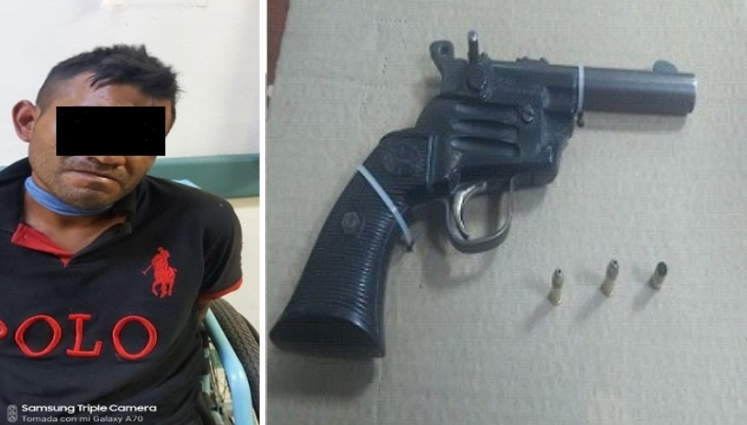 Uno de los dos individuos fue alcanzado en el cruce de las calles Josefa Ortiz y Francisco I. Madero, en la misma colonia, a quien se le confiscó un arma de fuego calibre .22 con dos cartuchos útiles, así como una bolsa de mujer y un teléfono celular Motorola modelo XT 1764, que fue identificado por la víctima como de su propiedad; asimismo se le encontró una batería recargable, reclamada como suya por el segundo ciudadano.