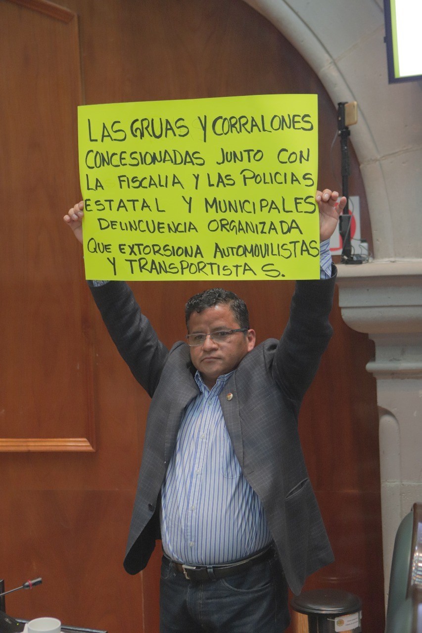 Al respecto, el diputado Gabriel Gutiérrez Cureño mostró una cartulina para manifestar que las grúas y corralones, junto con la Fiscalía y las policías estatal y municipales, se han convertido en delincuencia organizada que extorsiona automovilistas y transportistas.