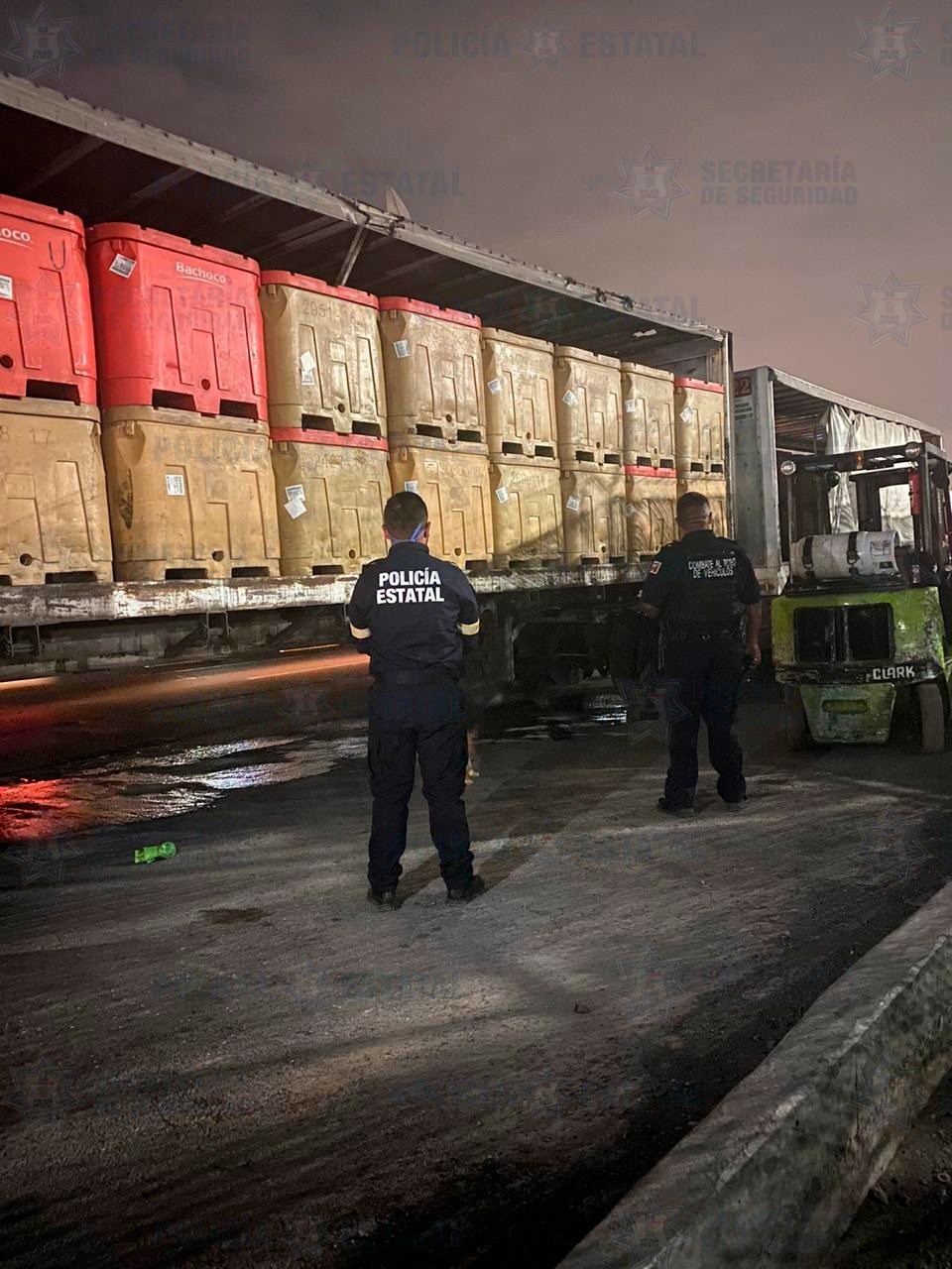 Elementos de la Dirección General de Combate al Robo de Vehículos y Transporte (DGCRVyT), que realizaban patrullajes para inhibir y disuadir actos delictivos sobre la carretera Teoloyucan-Jaltocan, de la colonia San Pedro Miltenco, visualizaron el tractocamión de la marca Mercedes Benz, que llevaba enganchadas dos plataformas tapadas con lona color blanco y con logotipos de una empresa comercializadora de pollo.
