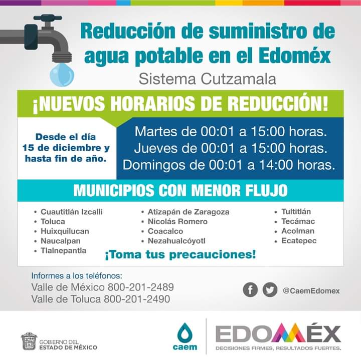 El Sistema #Cutzamala operará en diferentes horarios para la reducción del suministro de agua potable en 13 municipios del #Edomex, del 15 de diciembre hasta fin de año.