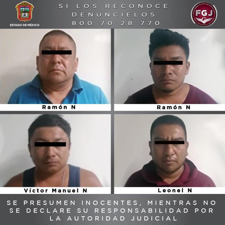 Estos cuatro sujetos, quienes son familiares, fueron asegurados por elementos de la Policía Municipal de Tenango del Valle y Policías Estatales, luego de que habrían golpeado y lesionado con un arma punzocortante a un hombre, ocasionándole la muerte.