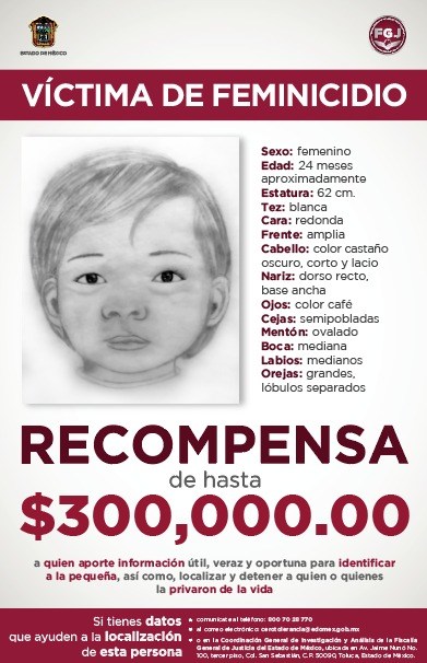 Mediante el acuerdo 10/2020 firmado por el Fiscal General, Alejandro Gómez Sánchez, la FGJEM autorizó la entrega de una recompensa de hasta 300 mil pesos para la identificación de esta pequeña de aproximadamente 24 meses de edad, que mide 62 centímetros de estatura, es de tez blanca, tiene cara redonda, frente amplia, cabello castaño oscuro, corto y lacio, boca mediana, labios medianos y orejas grandes.