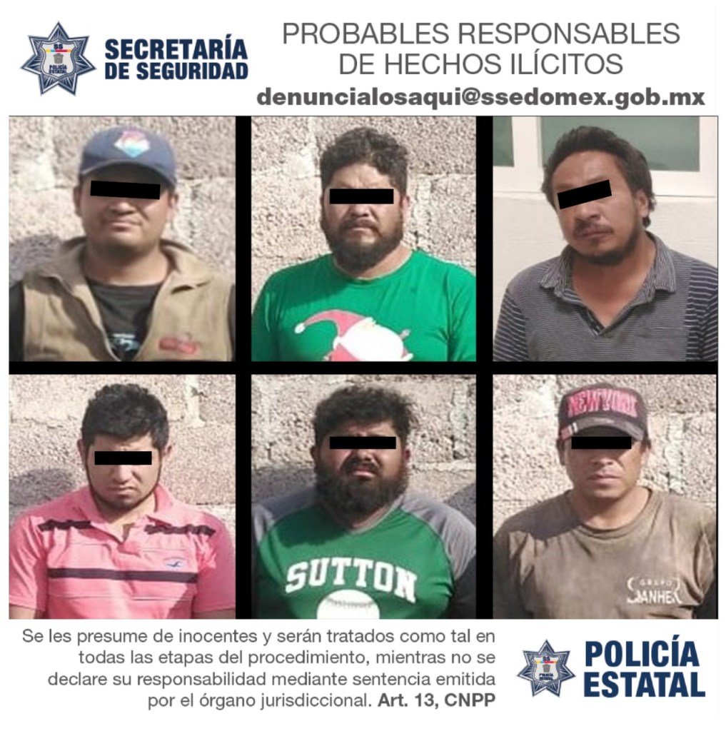 Dichos sujetos responden a los nombres de Michell “N” de 32 años; Anaúl “N” de 50; Diego “N” de 23; Edgar “N” de 43; Dorian Alain “N” de 29; Luis “N” de 42 años de edad, quienes fueron trasladados a la Agencia del Ministerio Público de Combate al Robo de Transporte con sede en Ecatepec de Morelos, para que ahí se determine su situación jurídica.
