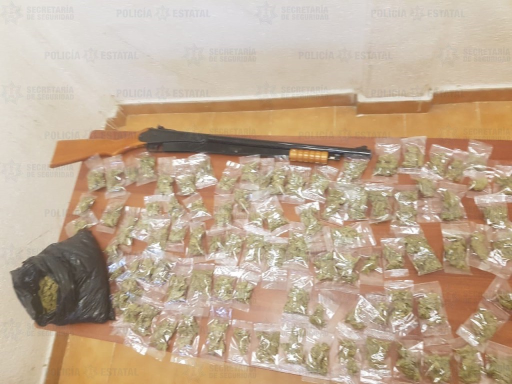Elementos de la Secretaría de Seguridad (SS) detuvieron a un hombre en posesión de dos kilos 800 gramos de presunta marihuana y un rifle de aire; también fueron detenidos dos individuos que se encontraban aparentemente negociando la compra de la sustancia.