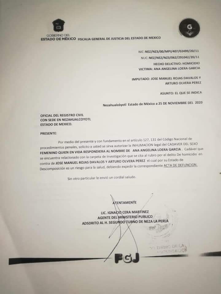 Todo iba bien, se realizaron los trámites de rigor, el ministerio público Ignacio Cera Martínez, adscrito al segundo turno, giró un oficio al oficial del Registro Civil en Nezahualcóyotl solicitando la inhumación legal del cadáver de quien en vida llevara el nombre de Ana Angelina Loera García.