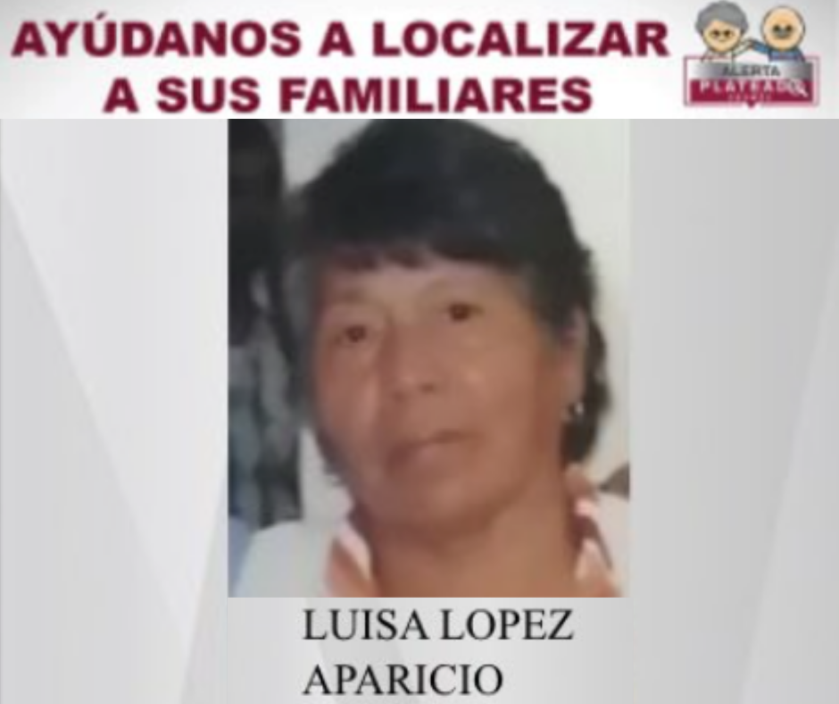 Autoridades del Estado de México emitieron un boletín de Alerta Plateada para localizar a Doña Luisa López Aparicio, de 70 años de edad, la cual fue vista por última vez el día 04 de octubre de 2020, en la colonia Ciudad Campestre en Nicolas Romero.