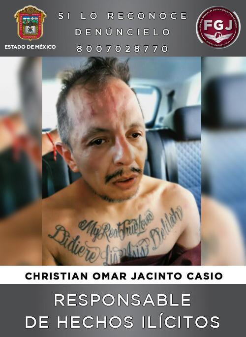 Una vez que la FGJEM tuvo conocimiento de este delito fueron realizadas diversas diligencias para esclarecer este feminicidio, con el avance de las mismas fue posible identificar al probable agresor por lo que fue solicitada una orden de aprehensión en su contra. Aunado a ello en julio del año 2019 la Fiscalía Estatal emitió un acuerdo de recompensa de hasta 300 mil pesos para la localización y aprehensión de Christian Omar Jacinto Casio.