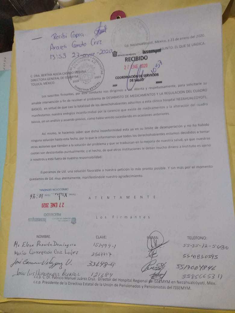 Por tal motivo esta Unión de Pensionados, el cual alberga a casi 5 mil adeptos, reunieron firmas y juntó con un escrito explicando la situación se lo hicieron llegar, el pasado 27 de enero a la doctora Bertha Alicia Casado Medina, directora general del ISSEMyM, donde le piden que se resuelva el problema del desabasto y que se regularice el cuadro básico.